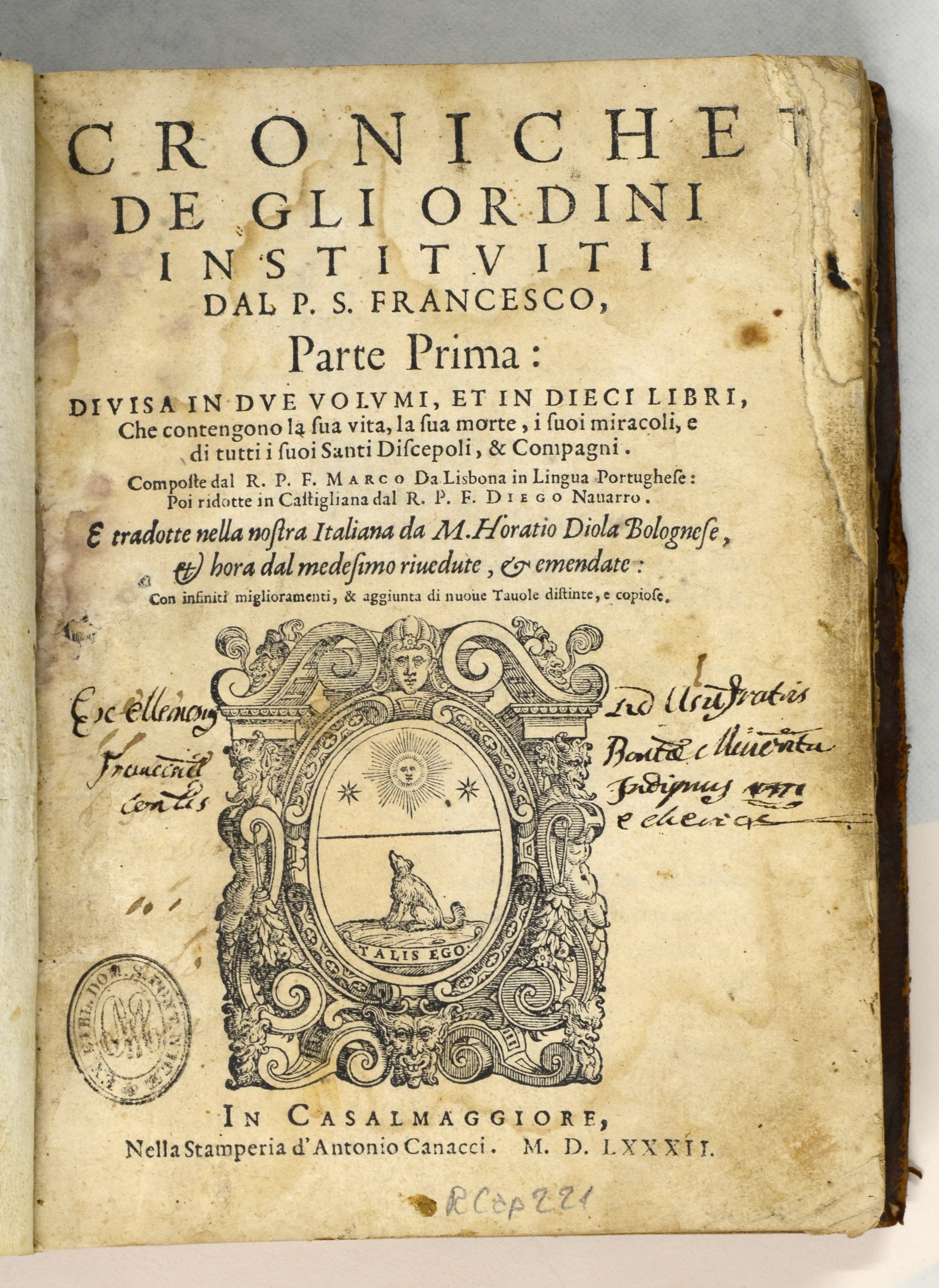 Sur la page de titre, à droite et à gauche de la marque : « Exellenc… sed usu fratris Franciscu(m ?) Bontà Minorita cen… (?) indiquus viti (?) et clerice ». |