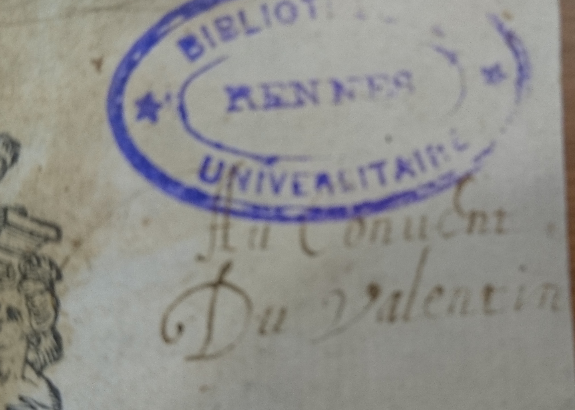 | Description | A droite de la marque typographique, du haut en bas, mention « Au couvent du Valentin » (XVII-XVIII ss.). |