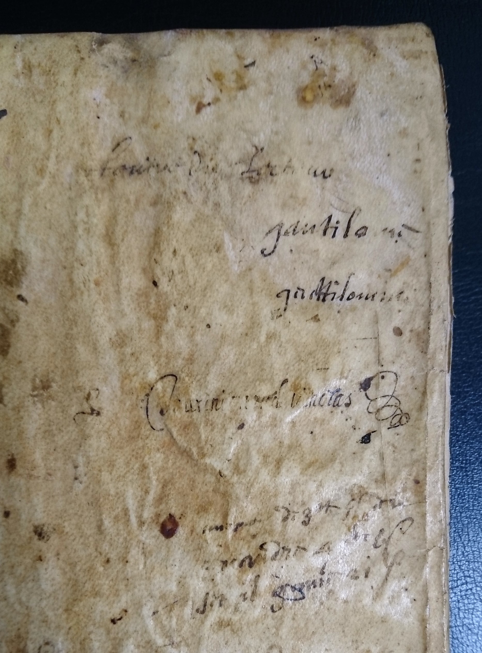 | Description | Rel. parch. souple portant des annotations diverses, dont « gautilome / genttilomme / ». Titre court au dos ms. Sur la première garde, plusieurs annotations de mains différentes. |
