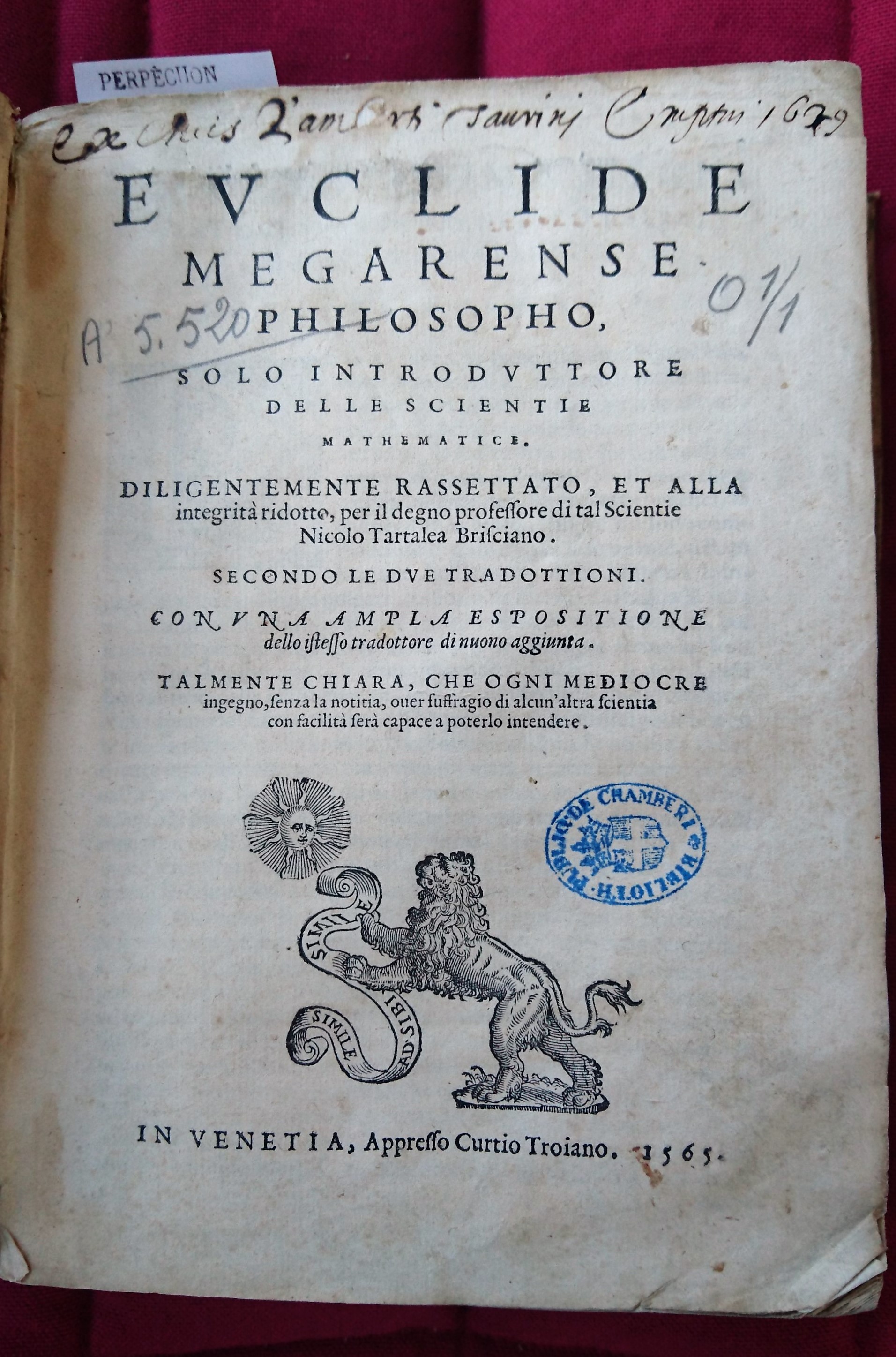 | Titre | Euclide Megarense philosopho, solo introduttore delle scientie mathematice. Diligentemente rassettato, et alla integrità ridotto, per il degno professore di tal scientie Nicolo Tartalea brisciano. Secondo le due tradottioni. Con vna ampla espositione del |