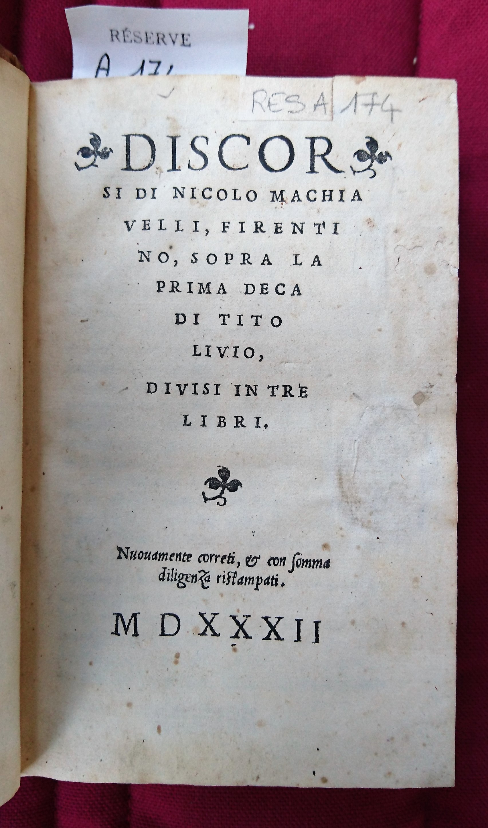 | Titre | Discorsi di Nicolo Machiauelli, firentino [!], sopra la prima deca di Tito Liuio, diuisi in tre libri. Nuouamente corretti, et con somma diligenza ristampati. |