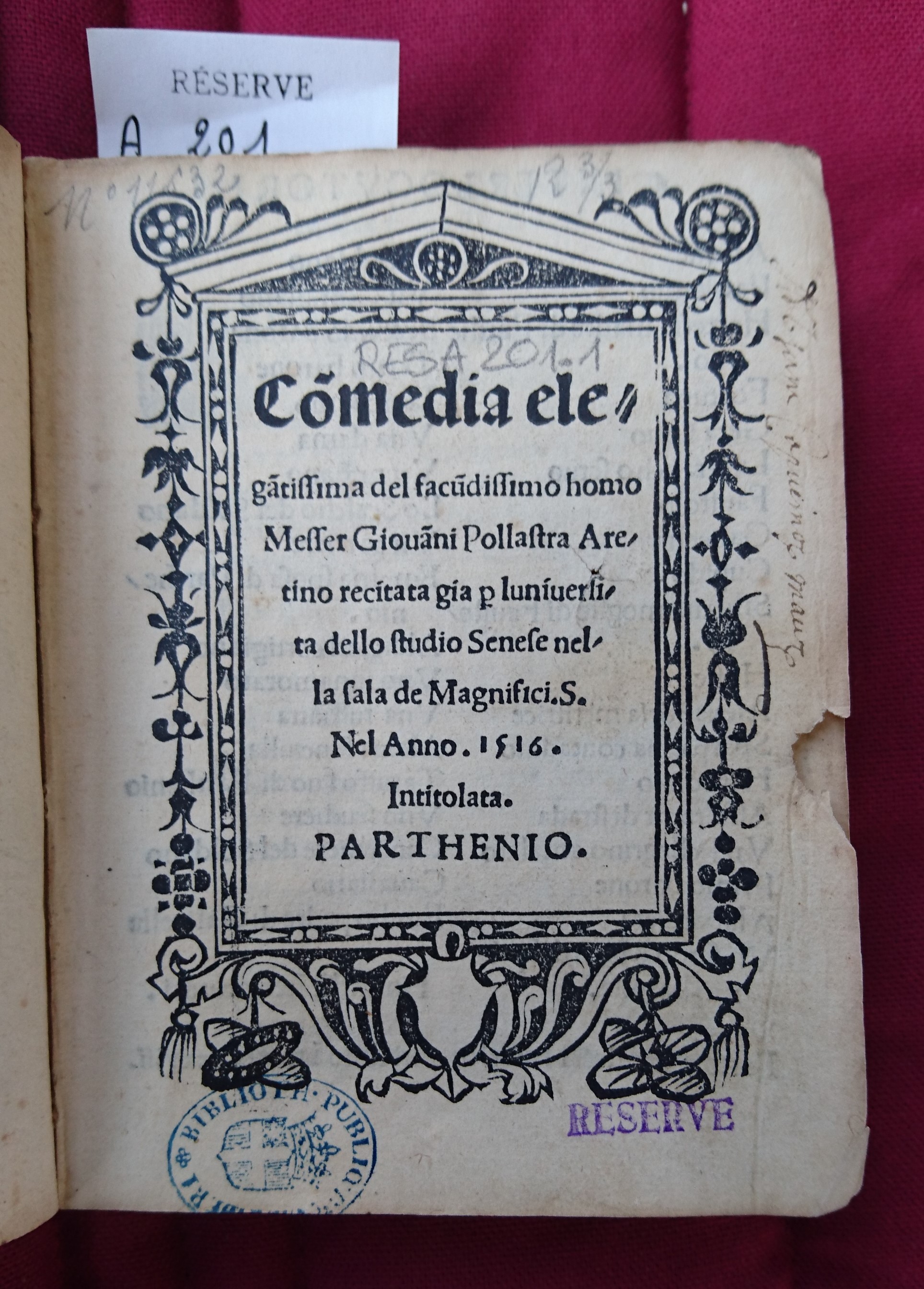 | Titre | Commedia elegantissima del facundissimo homo Messer Giouanni Pollastra Aretino recitata gia per luniversita dello studio Senese nella sal dei Magnifici S. Nel anno. 1516. Intitolata. PARTHENIO. |