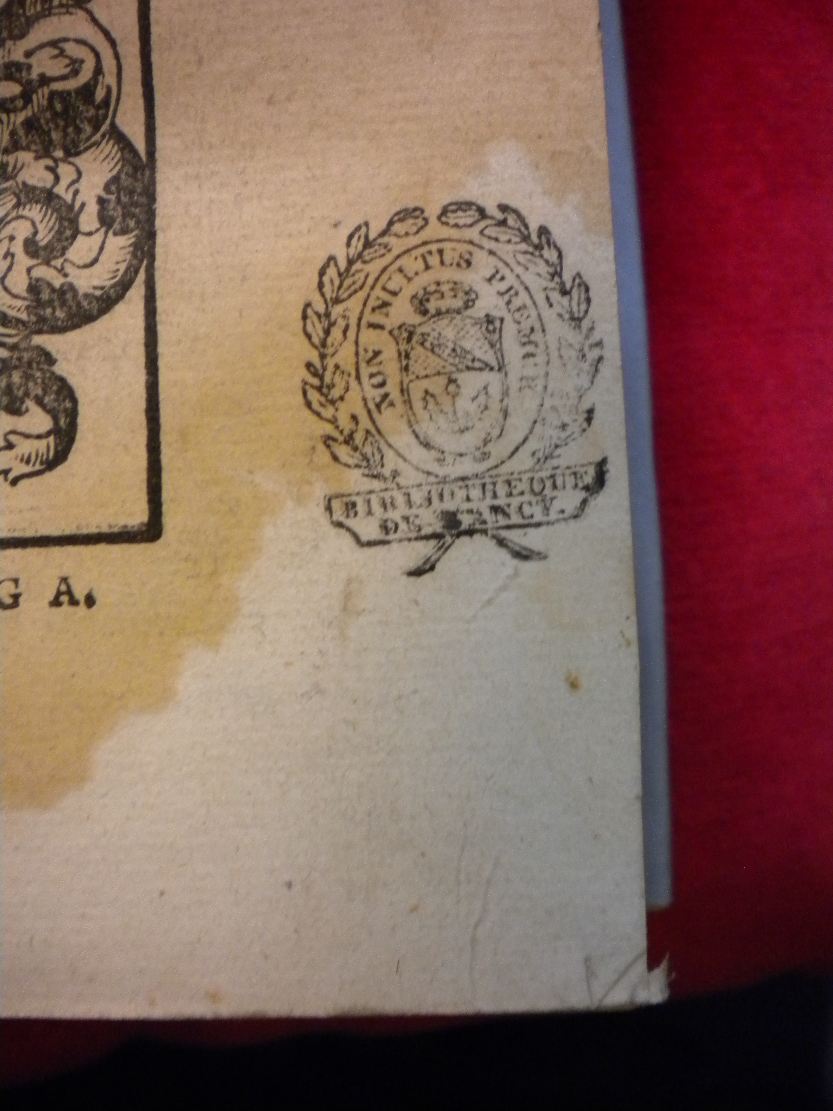| Description | Sur la page de titre, cachet de la bibliothèque de Nancy, datant du XIXe siècle. |
