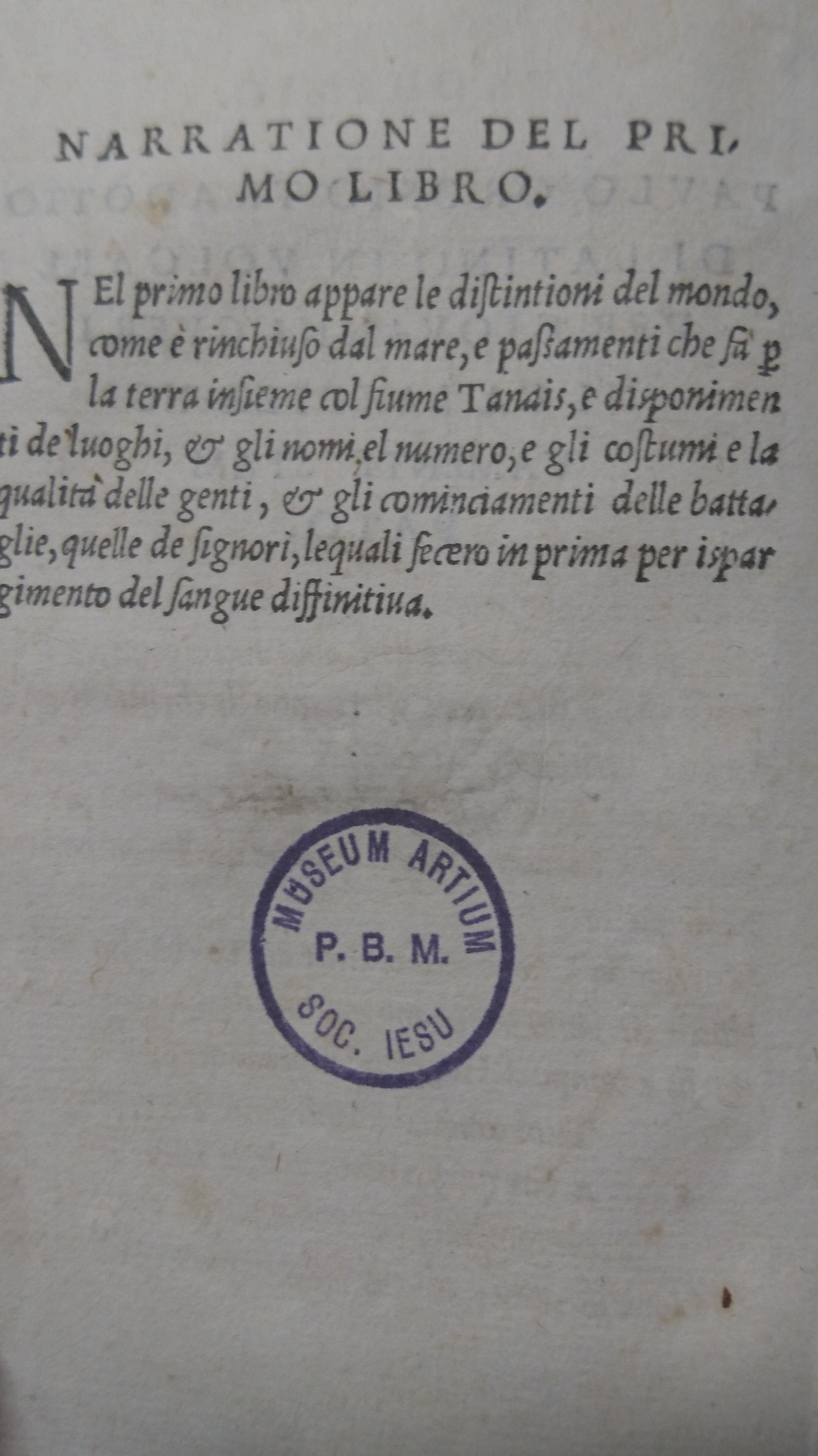 | Description | Sur le verso de la page de titre verso tampon à l’encre bleu « Museum Artium Soc. Iesu P.B.M.». |
