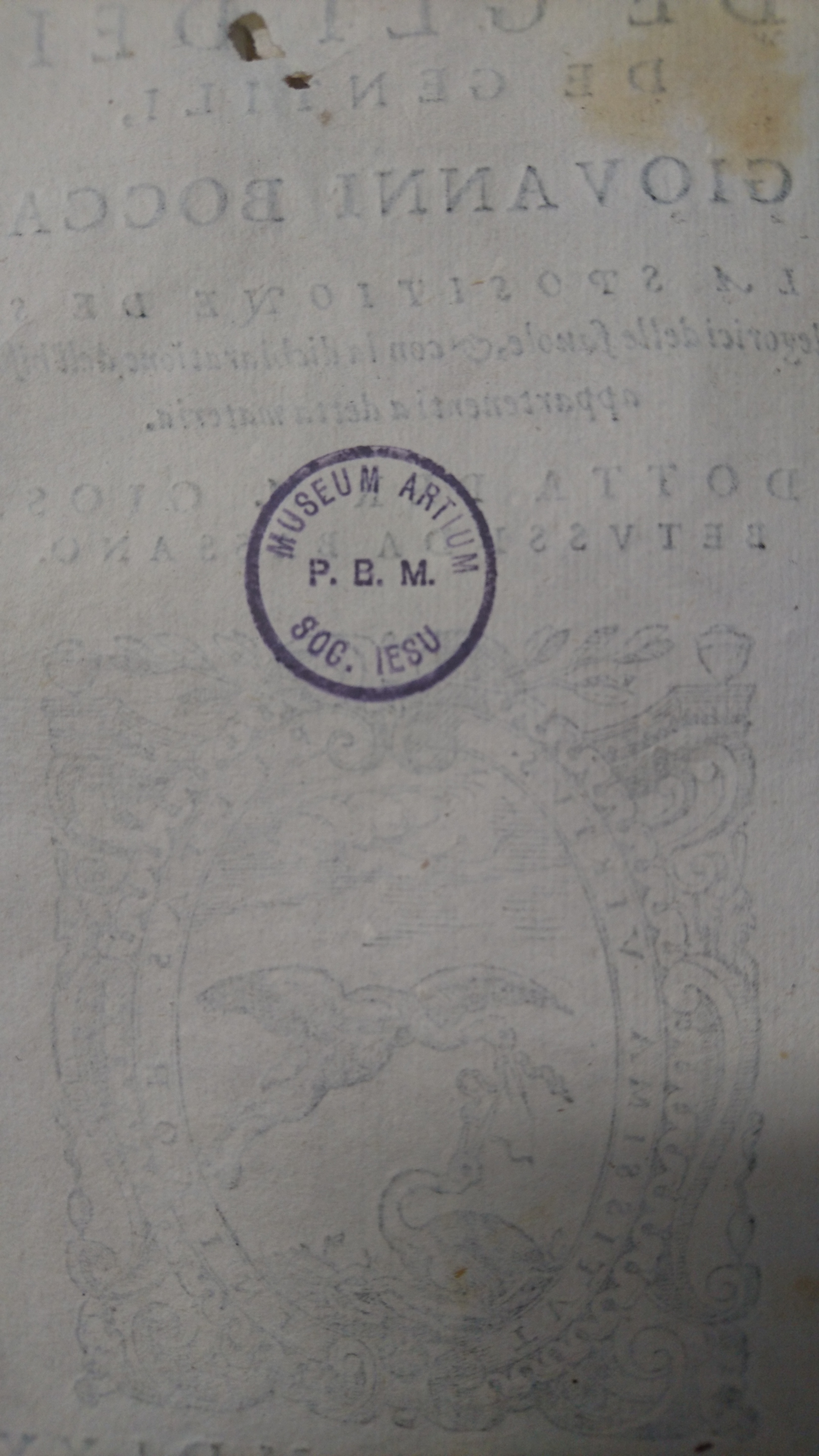 | Description | Sur le verso de la première garde : tampon à l’encre bleu « Museum Artium Soc. Iesu P.B.M.». |