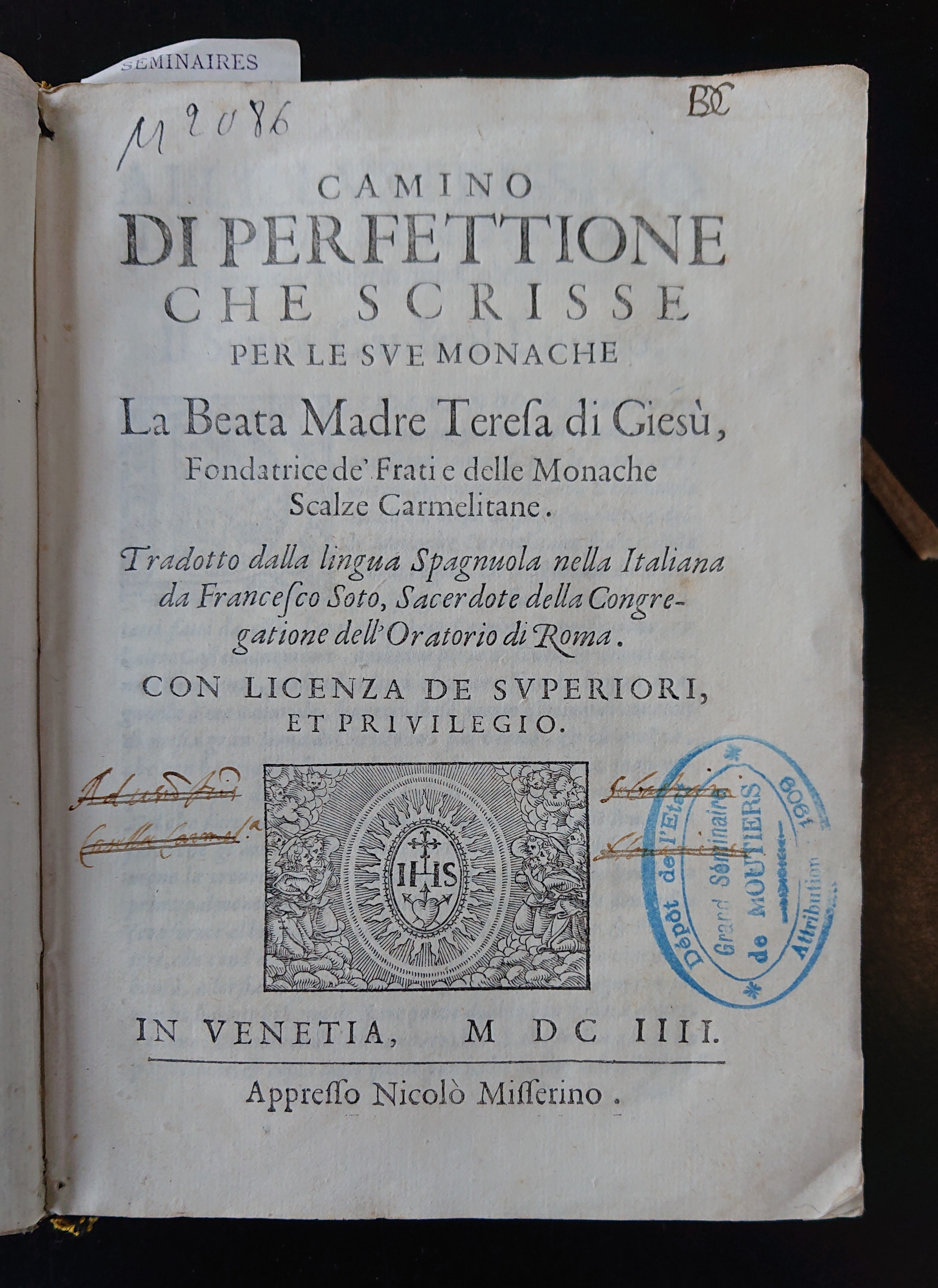 | Titre | Camino di perfettione che scrisse per le sue monache la beata mare Teresa di Giesù, fondatrice de' frati e delle monache scalze Carmelitane. Tradotto dalla lingua spagnuola nella italiana da Francesco Soto, sacerdote della Congregazione dell'Oratorio di R |